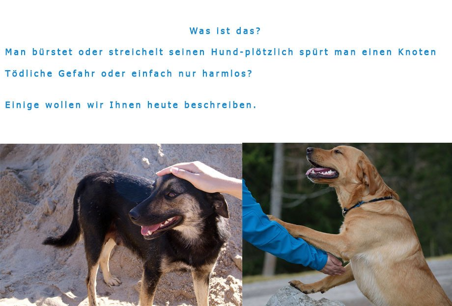 Einige wollen wir Ihnen heute beschreiben: Hautwarzen Kleine Warzen bilden sich vor allem bei einigen älteren Hunden an allen möglichen Stellen. Das kann mitten auf der Stirn genauso sein wie am Innenschenkel oder unter dem Kinn. Es ist letztlich ein Schönheitsfehler, den man nicht behandeln muss. Eine Ausnahme bilden allerdings Warzen, die sich entzünden oder an denen ständig vom Tier gekratzt wird. Solche Warzen sollten tierärztlich behandelt werden, da durch das ständige Kratzen eine größere Verletzung und Entzündung hervorgerufen werden kann. Knubbel & Beulen nach Impfungen Nach der Impfung oder anderen Injektionen beim Tierarzt kann es an der Einstichstelle zu einer Spritzenreaktion kommen. Bei einer Impfung liegt das häufig an den Lösungsmitteln der Impfstoffe, die manchmal eine solche Reaktion hervorrufen. Die meisten Spritzen- oder Impfreaktionen klingen nach wenigen Tagen wieder ab, manchmal dauert es aber länger. In so einem Fall sollte man den Hund seinem Tierarzt noch einmal vorstellen, um auszuschließen, dass sich ein Abszess gebildet hat – also eine mit Eiter gefüllte Kapsel. Das kommt sehr selten vor, aber wenn, dann sollte es behandelt werden. Talgdrüsen Wie bei uns Menschen produziert auch die Haut der Hunde Talg in Talgdrüsen. Solche Drüsen können sich auch mal entzünden und/oder zu viel Talg produzieren, bei Hunden meist einen größeren und manchmal auch schmerzhaft entzündeten Grützbeutel. Einige Tiere neigen dazu, andere bekommen es nie. Ein Grützbeutel kann ausgedrückt werden, wenn er nicht so schmerzhaft ist, aber manchmal füllt er sich wieder. Der Tierarzt kann die Wundhöhle spülen oder im schlimmsten Fall den Grützbeutel operativ entfernen, aber in den meisten Fällen ist das nicht nötig. Tumore Es gibt verschiedenste Arten von Tumoren, weshalb wir Ihnen nur zwei sehr häufige Arten beschreiben werden. Grundsätzlich gilt, dass ein Tumor erst als Krebs bezeichnet wird, wenn er bösartig ist. Gesäuge Tumoren kommen bei Hündinnen sehr häufig vor, aber auch bei Rüden kann so ein Tumor entstehen. Man erkennt sie am besten, wenn man den Bauch seiner Hündin regelmäßig beim Streicheln sanft durchtastet. Die meisten Tiere empfinden diese Untersuchung als angenehm, also keine Sorge. Wichtig ist, dass man von vorne in Höhe der Ellbogen bis zu den Innenschenkeln untersucht. Wenn man ein Knötchen findet, sollte man genau hinsehen. Handelt es sich nur um die Brustwarze oder liegt das Knötchen unter der Haut? Ein Gesäuge Tumor kann verschiedenste Ausmaße haben: es gibt sie in Form von vielen kleinen stecknadelkopfgroßen Knötchen, die dicht beieinander liegen, als einzelne haselnussgroße weiche Knubbel oder als riesige Geschwulste, wenn sie nicht entfernt werden und man sie wachsen lässt. Sie können weich oder hart, verschiebbar oder fest mit der Haut verwachsen sein und sie können unabhängig von ihrer Erscheinungsform gutartig oder bösartig sein. Die Verteilung gut- und bösartiger Tumoren am Gesäuge beträgt etwa 50:50 – und man weiß es erst sicher, wenn man den Tumor entfernen und pathologisch untersuchen lässt. Da die bösartigen Vertreter dazu neigen, Tochtergeschwulste (Metastasen) zum Beispiel in Knochen und Lunge zu bilden, sind sie hochgefährlich. Achtung: bei Knötchen im Gesäuge immer gleich zum Tierarzt gehen! Lipome Weit weniger gefährlich sind Lipome. Das sind Fettgewebs-Tumoren, die sich fast überall bilden können und manchmal sehr groß werden. Sie sind überwiegend weich und wachsen langsam. Manche Tiere neigen zur Bildung von Lipomen. Diese Schwellungen müssen meist nur dann entfernt werden, wenn sie an einer ungünstigen Stelle gewachsen sind und das Tier stören, zum Beispiel unter dem Ellbogen, wo sie das Laufen behindern. In diesem Fall ist eine Operation sinnvoll. Normalerweise muss ein Lipom nicht entfernt werden, allerdings sollte man sichergehen, dass es wirklich nur ein Lipom ist. Dies kann man mit einer Biopsie herausfinden. Der Tierarzt entnimmt dazu mit der Spritze nur ein paar Zellen, die pathologisch untersucht werden. So kann man auf Nummer Sicher gehen. Fazit: Bei nicht geklärten Schwellungen oder Knötchen sollte man auf jeden Fall seinen Tierarzt um Rat fragen – es muss sich aber nicht immer gleich um einen Tumor handeln.